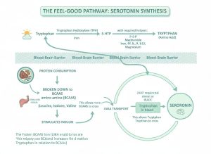 このセロトニンの原料は「トリプトファン」というアミノ酸ですが、その元をたどればタンパク質です。