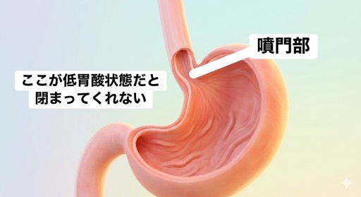 胃と食道の間には「噴門(ふんもん)」というフタがあります。胃の中が正常な「強酸性」であれば、このフタはピタッと締まります。しかし、アルカリ性に傾いている(低塩酸症)と、フタが緩んでしまう性質があります。