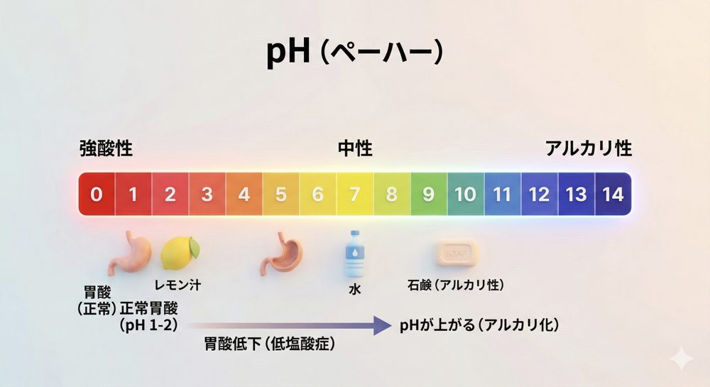 以下は、pHの概念と、胃酸の状態を視覚的に説明した画像です。