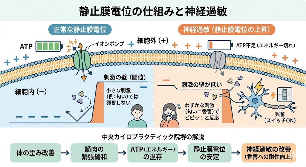 筋肉の無駄な緊張が取れれば、ATPの無駄遣いが防げます。エネルギーに余裕ができることで、神経の静止膜電位が正常に保たれ、過敏だった感覚が穏やかに落ち着いていくことが期待できます。
